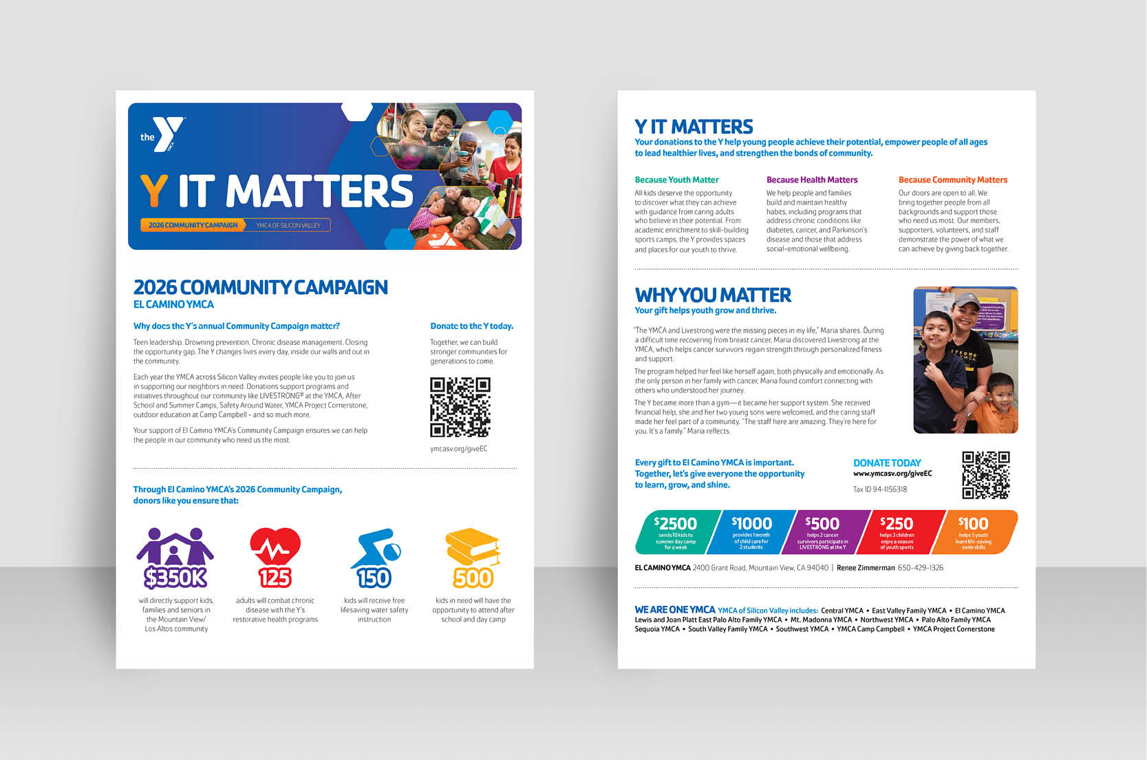 Approach: Design a compelling toolkit of over 100 assets for 11 Y locations that combines impactful imagery, reflecting the Y's three areas of impact: healthy living, youth development, and social responsibility. Clarify how membership fees are allocated to overhead, while donations fund community programs, like Youth & Government and Livestrong at the YMCA. Include compelling stories of those who have benefited from this programming, and provide clear calls to action around donations.
