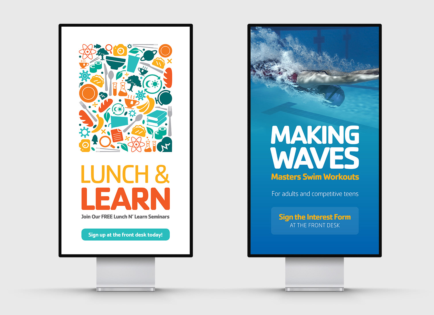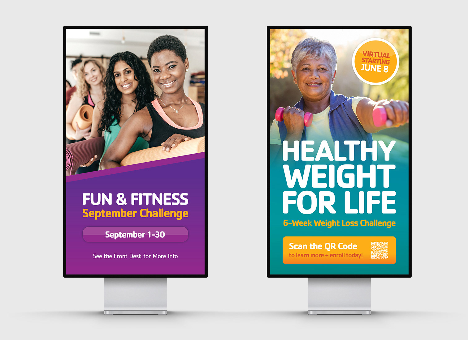 Digital displays showcase vibrant visuals and engaging content that is easily changed or scheduled. They capture attention and enhance the customer experience in a visually impactful manner. The digital slides here promote paid programs, promotions, and free events for youth and adult members, and the community.